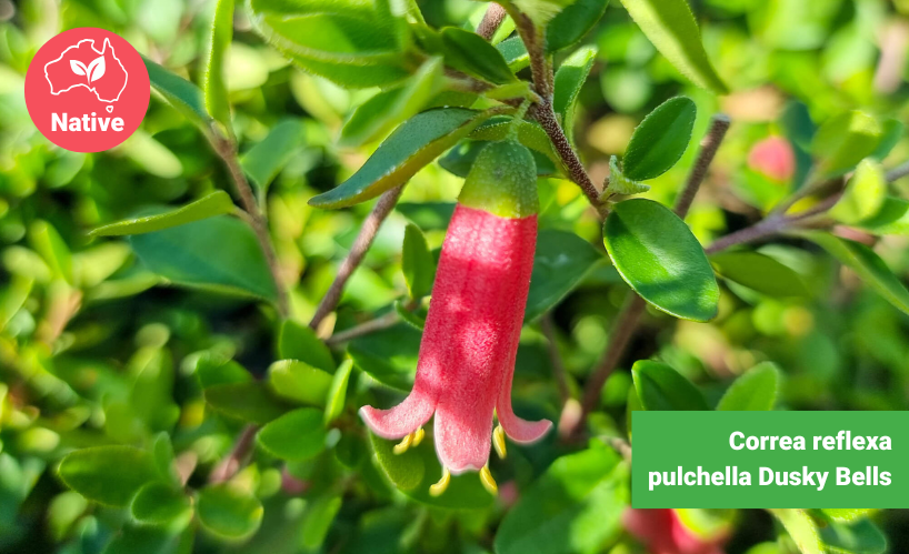 Why we love it: Attractive, pendulous bell-shaped flowers appear through the cooler months, providing valuable winter interest and an important food source for smaller birds. Correa Dusky Bells can be clipped into a neat sphere as a native alternative to English Box (Buxus sempervirens) or you can grab ready-clipped spheres at Plantmark.