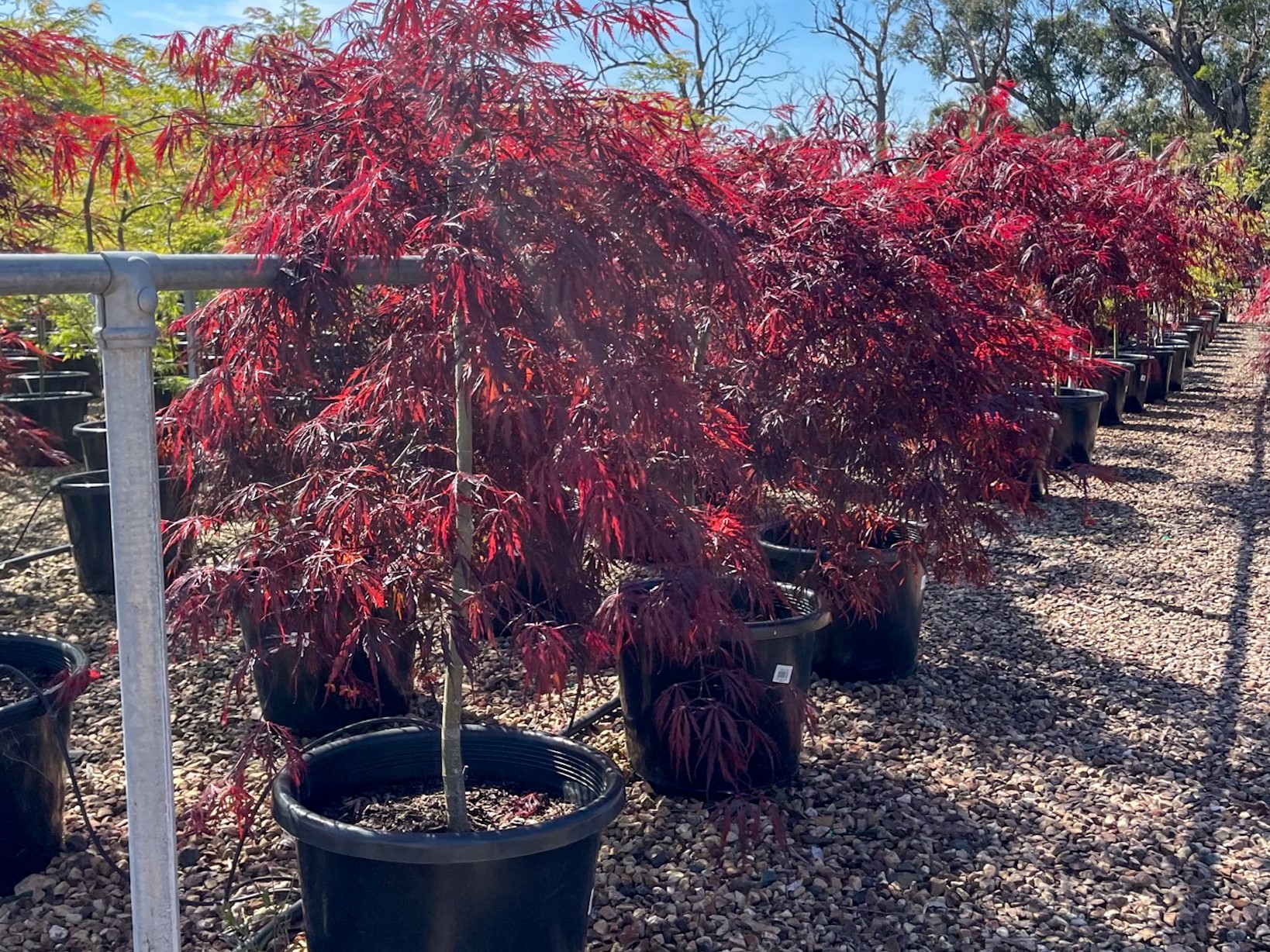 Beautiful deciduous, Japanese Maple perfect for home gardens. Lacy, deep red leaves through summer are held on a head approx 2m across. Grows to approx 2.5m tall and has an interesting mounding / spreading habit. Plant in a sheltered position, either as a feature or as a ground for a stunning Autumn display. Can also be purchased a grafted standard.