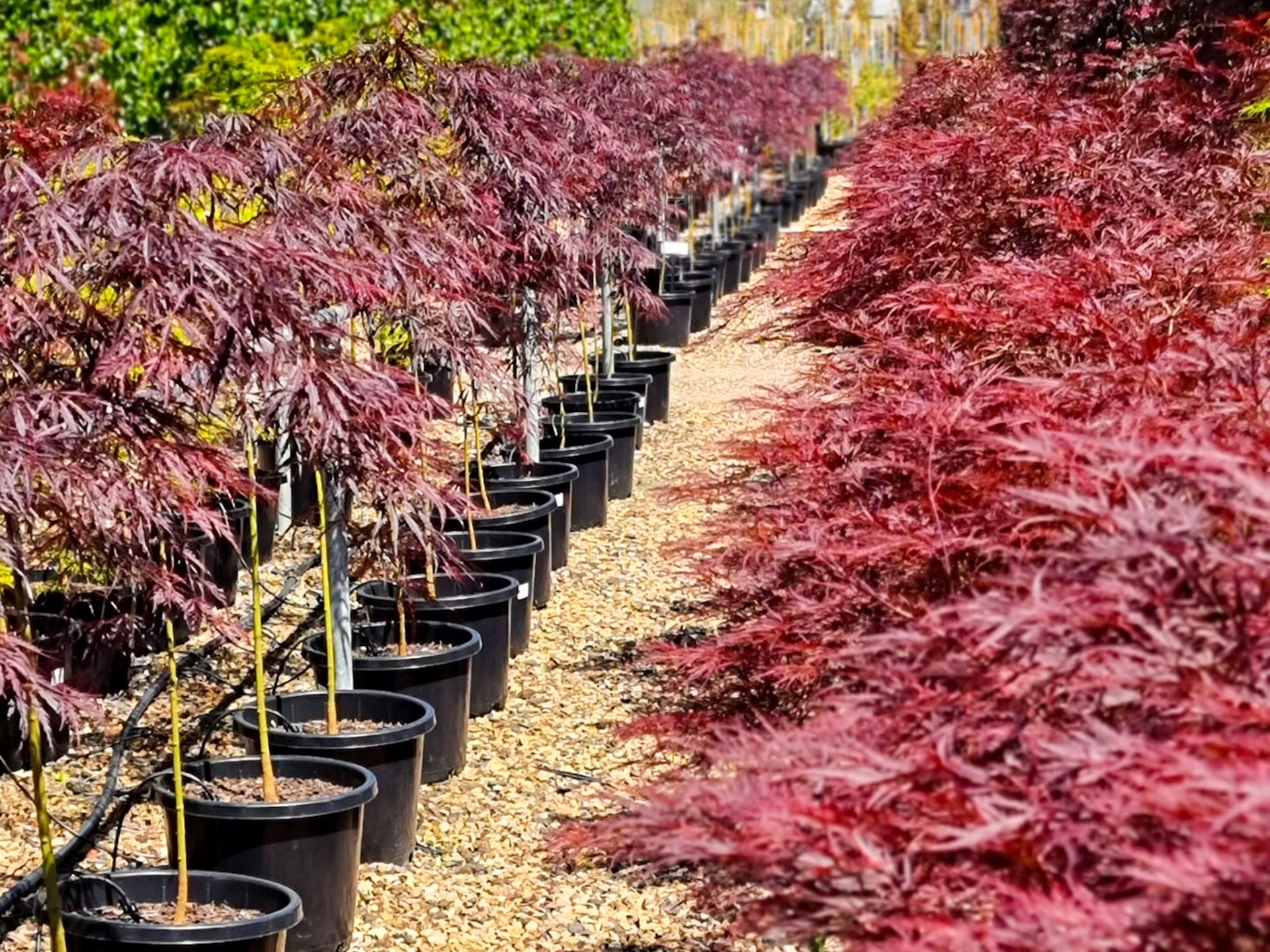 A ornamental dwarf Maple, Skeeter's Broom has a very attractive upright slender habit with soft vibrant rich foliage that ranges from bright red in Spring, to burgundy with slight green in Summer, and then deep red again in Autumn before it drops in Winter. The Best colour display is found when planted in cooler climates. It will get to about 1.5-3m tall to 1.5-2m wide. Makes a fantastic feature specimen, use in mixed plantings, also ideal for containers, giving year round colour interest to the landscape.