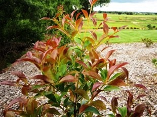 Red Head™ Acmena is an attractive large shrub/small tree with glossy rounded, deep green foliage. New growth flushes red to deep claret then changes to chocolate before hardening off the dark green. The dense foliage can be pruned down to 1.5m high and is fire retardant. Clusters of small white flowers are followed by bright purple edible berries. Size: 6m high x 2m wide. Uses: Ideal for specimen planting, hedging and screening.