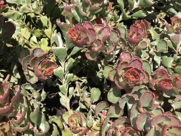 A ornamental small shrub native to Western Australia with fantastic coloured and textured foliage that is grey with the new growth forming red frilled tips that shows its full colour over the warmer months. A ideal plant for borders and looks great when planted in large groups.