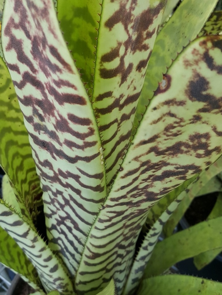 Attractive bromeliad with green and brown variegated leaves and a stunning large red and yellow star-shaped flower head that appears on a stalk of mature plants during Spring. Fantastic tropical feature plant for a container or plant in mass for great colour contrast in the garden. Grows approx. 30cm tall x 40cm wide.