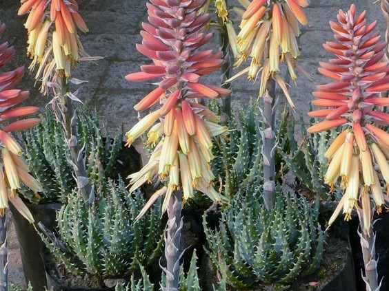 Pastel red to cream bi-coloured flowers appear in mid winter on this very decorative small ball shaped aloe comprising of blue-grey leaves with white spines. Grows approx. 20cm tall x 20cm wide.