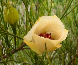 This evergreen Australian native shrub will grow to around 2m x 2m. It is sometimes a scrappy growing plant that can be trimmed to create a bushier shrub. Has deeply divided bright green needle like leaves and tubular creamy yellow flowers with a maroon centre in mass throughout spring and summer.