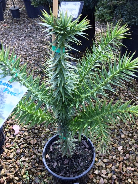 The Brazilian Monkey Puzzle Tree is native to South America. A slow growing long lived evergreen tree that can reach up to 35m. Unique dark green whorled foliage and smooth bark with rings circling the trunk. This tree has a conical habit while young maturing to a vertical tree with an umbrella canopy. Fantastic streetscape or park tree for coastal areas.