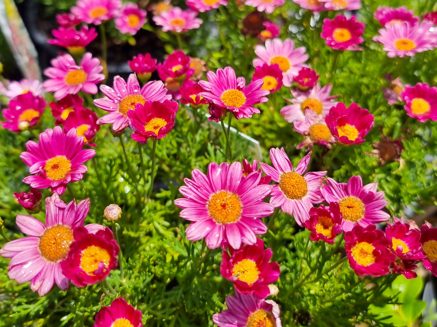 Very popular short-lived shrub with daisy-like, yellow centred flowers. Foliage is dark green, deeply cut and fragrant when brushed against. A great choice when you need a fast-growing, flowering border plant. Comet Series comes in a range of colours including red, pink and white. Grows approx. 50cm H x 40cm W.