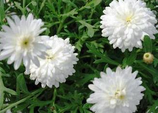 Very popular but short-lived perennial or shrub with clean daisy-like, yellow centred flowers. Foliage is dark green, deeply cut and fragrant when brushed against. A bushy classic growing to approx 60cm tall. Many cultivars are available, in single and double flowering forms. A great choice when you need a fast growing, flowering border plant. Double White has clean, double white flowers and a mounding habit.