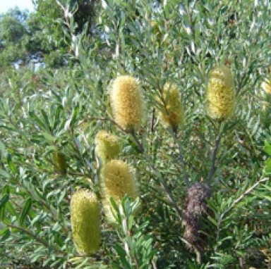 Native shrub with varying habits. Green upper-leaf and silvery undersides ensure interesting foliage complimented by yellow banksia flowers for much of the year.