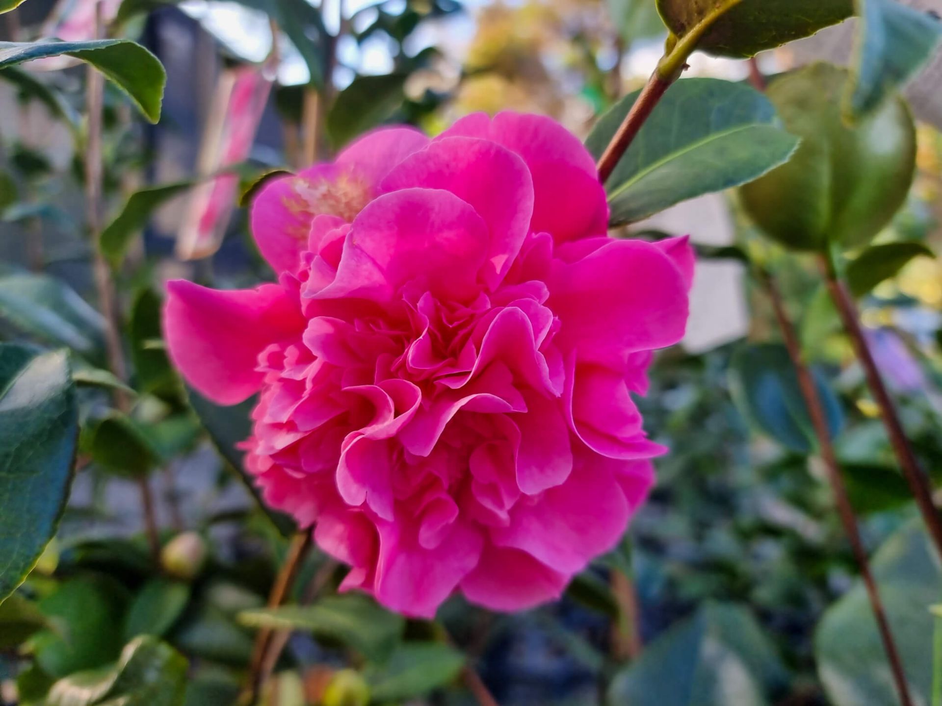 Large upright evergreen shrub with shiny dark green foliage and beautiful small deep-red formal double flowers. Flowers appear from winter through to spring. Great for planting under trees or in a semi-shade position, growing to around 2.5m tall.
