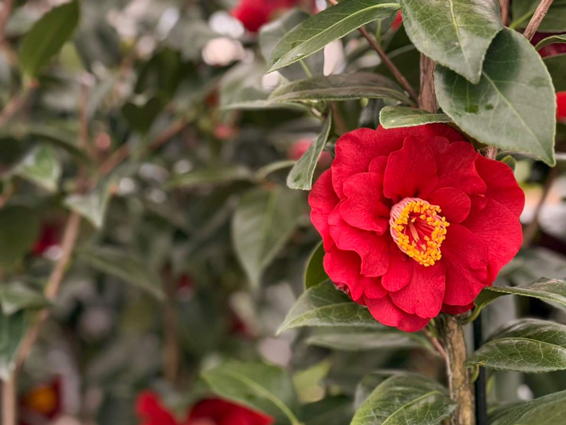Large upright evergreen shrub with shiny dark green foliage and beautiful large red semi-double flowers. Flowers appear from Winter through to Spring. Great for planting under trees or in a semi-shade position, growing to around 2.5m tall.