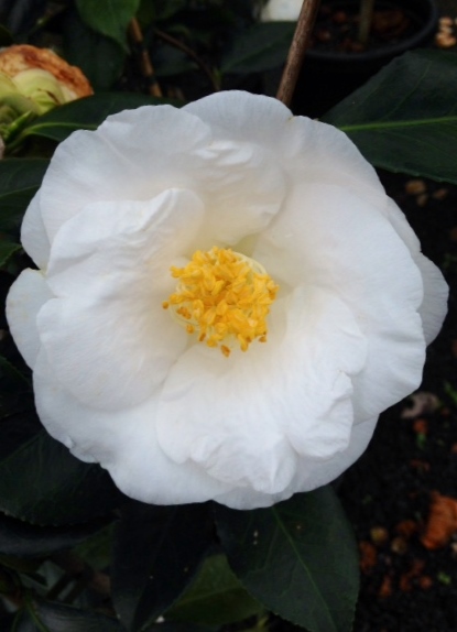 Large upright evergreen shrub with shiny dark green foliage and beautiful large white semi-double flowers with yellow stamens. Flowers appear from mid-Autumn through to Spring. Great for planting under trees or in a semi-shade position, growing to around 3m tall.