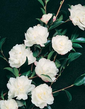The Petite Series of Camellia are well known for their compact shape, small leaves and abundance of small flowers. Little Liane is known for its small leaves and compact form. It produces masses of flowers which are proportionately small, white with a faint pink margin borne in a loose informal peony form. Tolerates both heat and light frosts.
