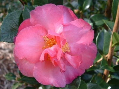 Large upright evergreen shrub with shiny dark green foliage and beautiful rose-pink double flowers. Flowers appear from late Summer through to Winter. Great for planting under trees or in a semi-shade position, growing to around 4m tall.
