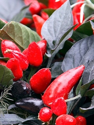 Small attractive perennial producing masses of small, edible, hot flavoured bright-red fruit with purple foliage. May even be displayed indoors for short periods. Flowers are white or purple in colour. Suitable for containers.