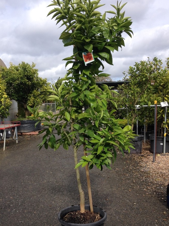 Mediterranean Sweet Orange is a large growing citrus, that bares medium sized sweet and juicy fruit with few seeds. The thin skin and flesh are a pale orange colour. It produces a large quantity fruit from July to August.