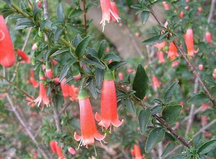 A compact shrub with dark green foliage and masses of orange pendulous flowers occurring during Autumn to Winter. A hardy attractive form tolerating most well drained soils, frost and extended dry periods.