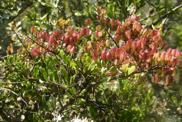 A hardy native shrub with small dark green leathery foliage and decorative bright red seed capsules occurring in summer. A useful hedging or screening plant that will tolerate dry and coastal conditions.
