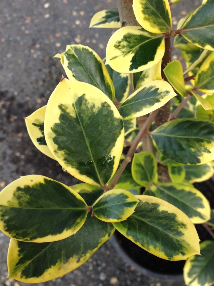 Hardy slow-growing evergreen shrub with dense dark-green and golden variegated foliage. Tiny fragrant white flowers during Spring followed by red or orange decorative fruits. Perfect for hedging. Grows approx. 5-10m tall.