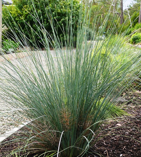 Attractive grass-like Australian native with tall, upright silver foliage and a clumping growth habit. Masses of blue-purple flowers are produced during autumn, winter and spring and these slowly change colour to yellow during the seasons. A tough plant that tolerates a wide variety of conditions and soil types. Grows to 1m tall x 80cm wide.