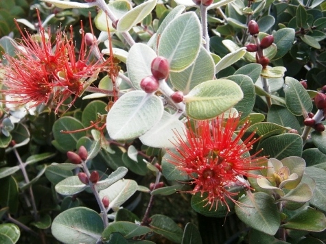 Impressive silvery-green foliage shrub bursting with red flower colour in Winter through to Spring. Really useful in coastal sites, tolerates salt-spray and wind. Makes a great container plant, for around pools and as a low hedge.