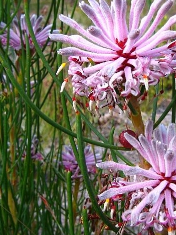 A small, hardy native shrub, with an open spreading habit. Naturally occurring along the southern coast of Western Australia. During the warmer months it features red, soft grey and pink flower spikes that make a beautiful display contrasting with the grey green upright cylindrical leaf spikes. Ideal for planting in containers, garden beds and rockeries.