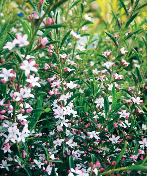 Dense, aromatic foliaged green native shrub with masses of white spring flowers bursting from pink buds. Waxy foliage is dense to the ground making a great informal hedge.
