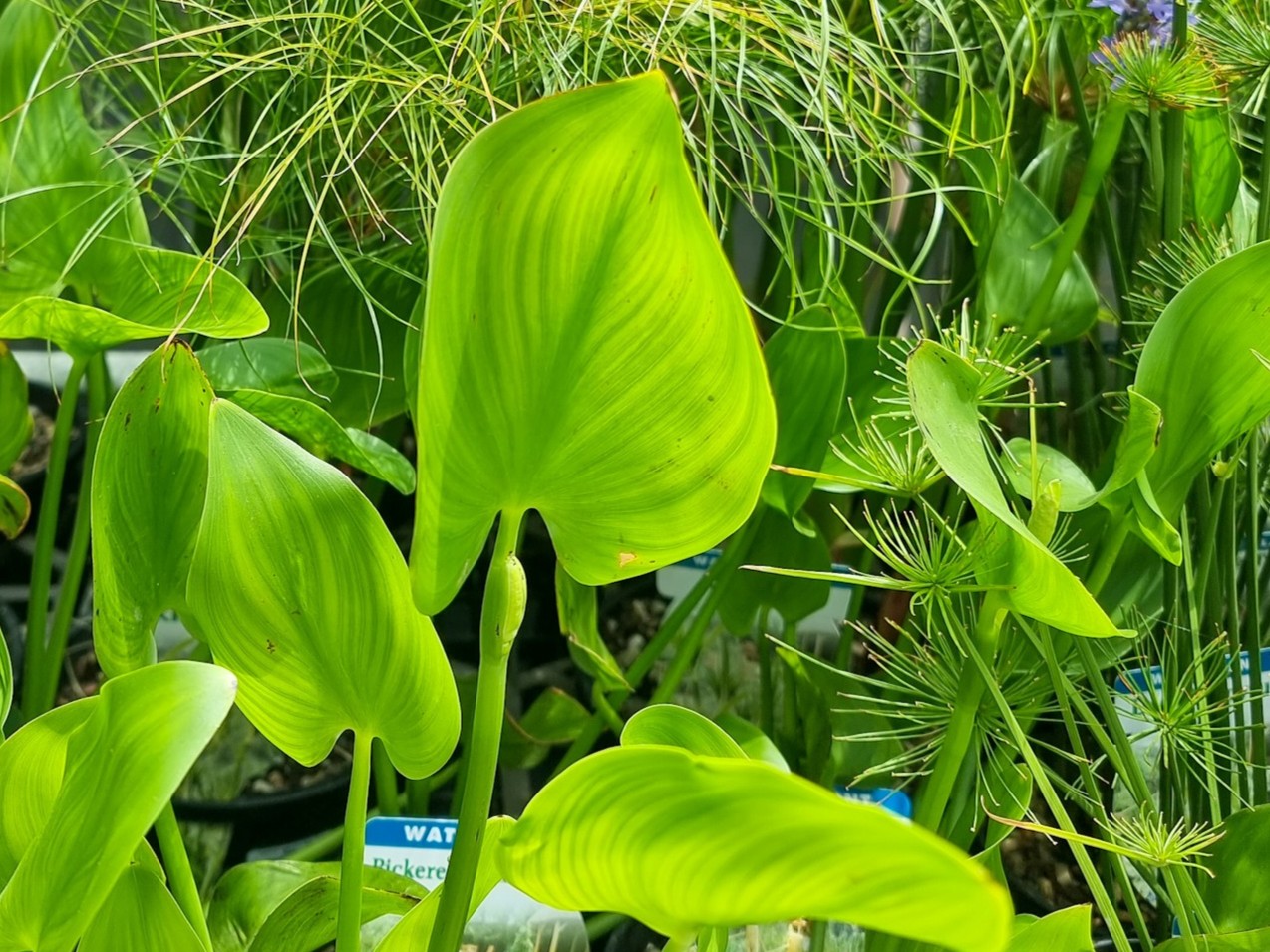 Attractive aquatic plant with upright arrowhead-like shiny green leaves that rise above the waters surface and masses of light-blue flower spikes that sit on stalks 15-30cm above the waters surface. Ideal for small to medium sized ponds. Seeds from this plant are edible.