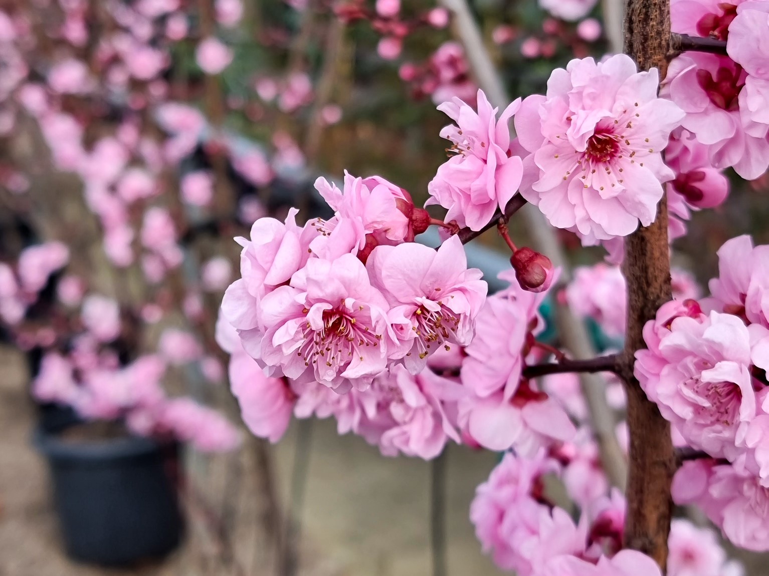 A non-fruiting, flowering plum growing to 5m tall with an upright habit that becomes rounded with age. Masses of beautiful double pink flowers in spring are followed by bronzey-purple foliage. Wonderful as a feature tree, dramatic mass planted as an avenue.