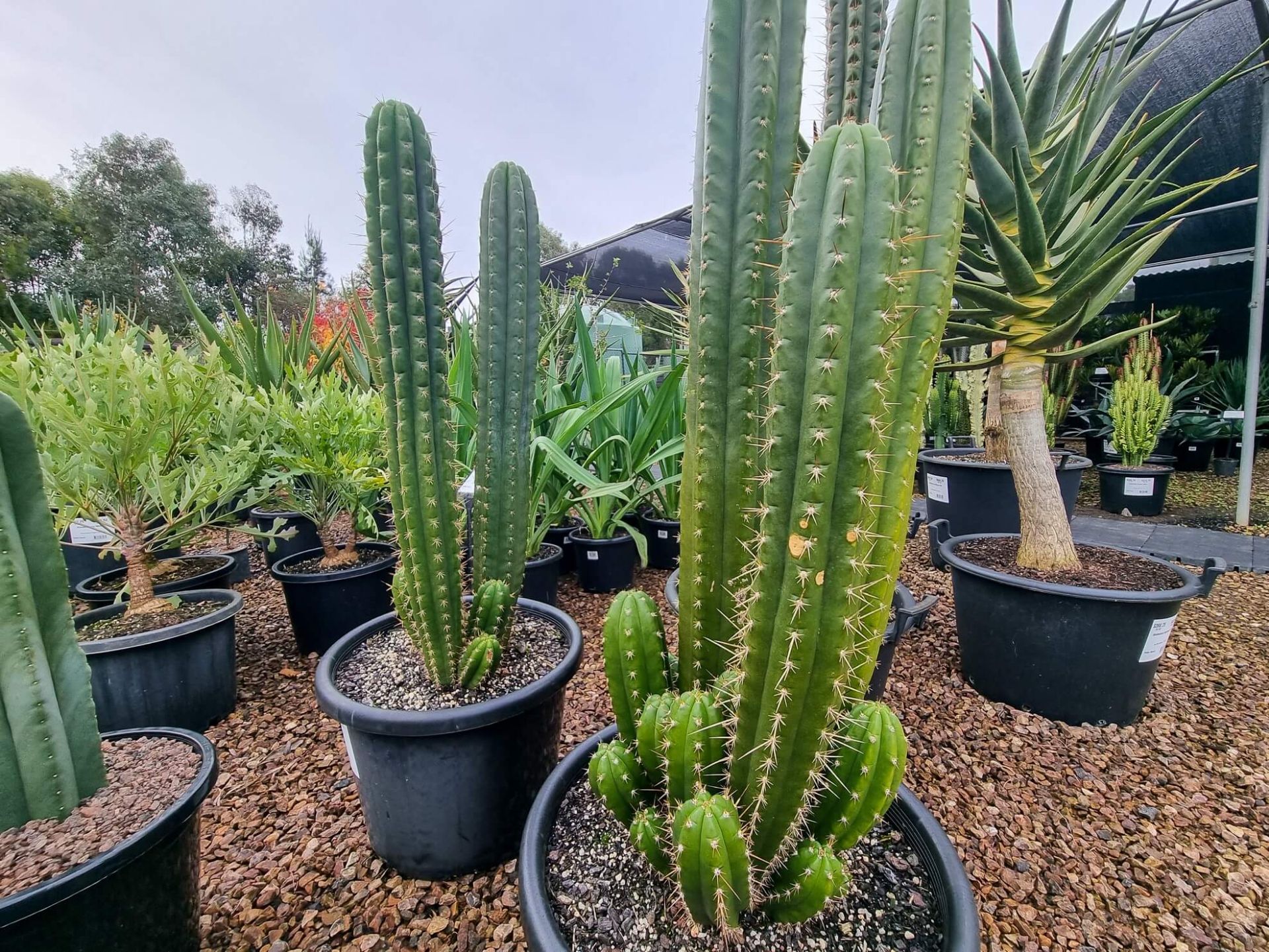 Attractive tall upright tree-like cactus with pale green to blue green fleshy skin and spines. Nocturnal fragrant white flowers in spring and summer. Great feature in gardens or containers. Grows approx. 3-6m H x 1.5-1.8m W.