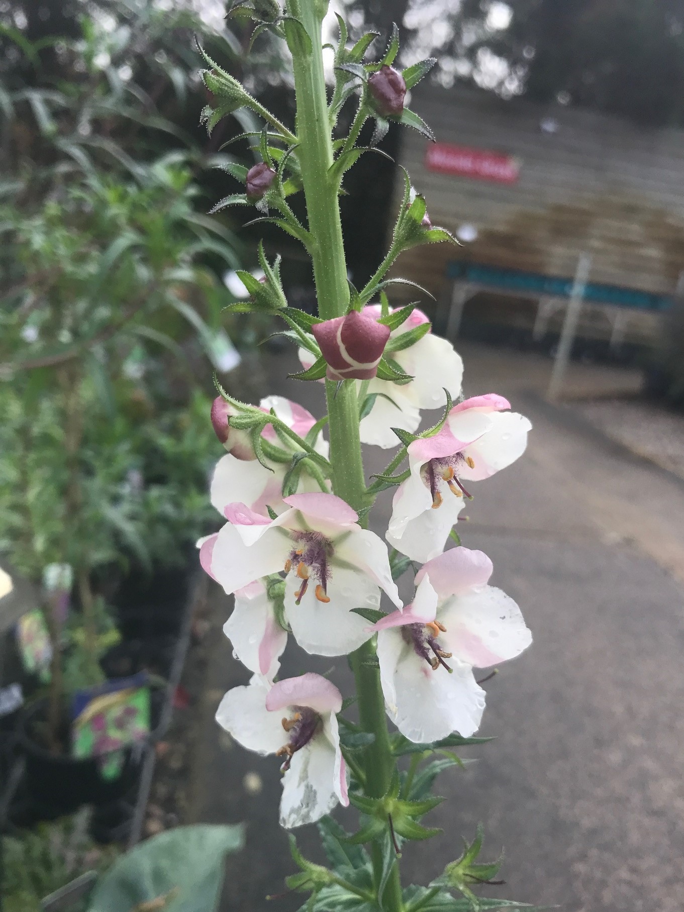 A hardy, herbaceous perennial with soft grey green hairy foliage. Throughout Spring tall flower spikes appear covered in white blooms with purple centres. An attractive cottage plant looking great amongst mixed plantings and as border plant.