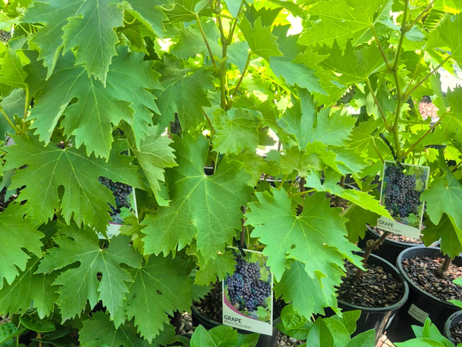 Fast-growing deciduous vine with green grape-leaf shaped foliage and edible fruit that is great for growing over pergolas or a fence. 'Black Muscat' is a large sweet black grape that can be eaten fresh or used to make wine.